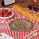 Pretty art deco glass flower medallion in irridescent copper, silver and blue on a black background. Has a striking metallic effect. Nice for an elegant autumn ocassion.