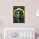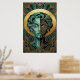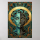 A stunning masterpiece of avant-garde design, this Art Deco portrait features a stylized woman's face rendered in a bold, geometric cubist style. With a color palette of deep teal, midnight black, and shimmering gold, the face is perfectly centered against a radiant sunburst circle. Intricate chevron and geometric patterns frame the composition, making this an ideal statement piece for a modern gallery wall, upscale office, or sophisticated living room.
