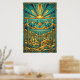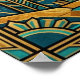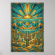 Experience the majestic beauty of the Southwest through a lens of vintage glamour. This "Desert Deco" poster features a breathtaking landscape of geometric mountain ranges and stylized saguaro cacti, all set beneath a magnificent sunburst horizon. The artwork is defined by its intricate, multi-layered fan motifs and sharp angular lines, rendered in a stunning palette of vibrant teal, sun-drenched orange, and shimmering metallic gold outlines.