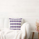 This throw pillow has an art deco design of white hexagons with a black line down the middle and pink diamonds.