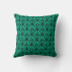 This throw pillow has an art deco design of diamonds with vertical and diagonal lines and circles on a field of retro blue green.