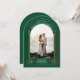 Save the Date in bold Art Deco style, showcasing a gilded bronze geometric motif set against a deep emerald green backdrop. The unique arch-cut layout highlights your photo at the centre, creating a dramatic and personalised statement. This design pairs vintage glamour with modern elegance, blending 1920s-inspired luxury with a sleek, contemporary aesthetic. Ideal for couples drawn to timeless sophistication, this photo save the date makes a dazzling first impression. Keywords: Art Deco, gilded bronze, emerald green, vintage glam, photo save the date, arch cut, elegant, modern.