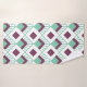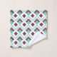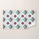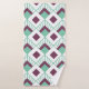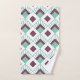 This towel set has an art deco design of seafoam green diamonds with diagonal lines and eggplant diamonds on a field of white.