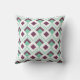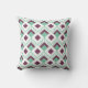 This throw pillow has an art deco design of seafoam green diamonds with diagonal lines and eggplant diamonds on a field of white.