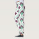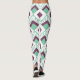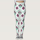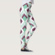 These leggings have an art deco design of seafoam green diamonds with diagonal lines and eggplant diamonds on a field of white.
