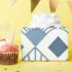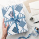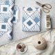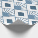 This wrapping paper has an art deco design of dusty blue diamonds with diagonal lines and dark blue diamonds on a field of white.