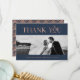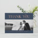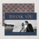 This elegant wedding thank you card features a faux rose gold look on navy blue, with glam text and art deco elements. Add your own personal photo.