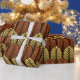Wrapping paper in a vintage Art Deco wallpaper pattern based on a stylised feather - rust brown and light chamois yellow, on a dark chocolate brown background