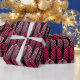 Wrapping paper in a vintage Art Deco wallpaper pattern based on a stylised feather - deep fuchsia pink and soft pink, on a black background