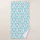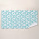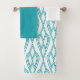 This towel set has a white washcloth, a turquoise hand towel, and a bath towel with an Art Deco design of diamonds connected by curved lines in turquoise.