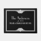 This beautiful design combines straight lines and triangles to make this interesting black and white Art Deco style door mat. Dress up the entry to your home with this elegant doormat design from Night and Day Designs. Personalisation includes family name and year established. Includes a quote that reads "You are a stranger here but once." All of the text is done in Art deco type styles.