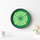 Clock in overlapping geometric patterns, consisting on gradient stripes, ranging from medium to pastel lime green, on an emerald green background, with 3-d look diamond shaped accents at the hours.