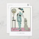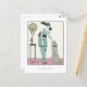 A postcard with the vintage Art Deco fashion illustration, IL A ÉTÉ PRIMÉ - Robe du Soir by Francisco Javier Gosé (1876-1915), a Spanish illustrator. A digitally enhanced image from the French Gazette Du Bon Tonne. A woman in a teal-coloured evening dress petting her dog.