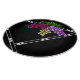 The original digital painting adorning this round, tempered glass cuting board depicts 3 luscious bunches of vibrantly coloured grenache, chardonnay + merlot grapes against a black field criss-crossed w/ black, white and silver strips.