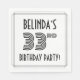 This luxurious thirty-third birthday celebration paper napkin design features a custom name, a fancy art deco style inspired number “33rd”, the message “BIRTHDAY PARTY!”, and a multi-line border. Paper napkins like these might be used when celebrating somebody’s 33rd birthday. [~Z0000613]