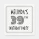 This stylish thirty-ninth birthday party/celebration paper napkin design features a custom name, a fancy art deco style inspired number “39th”, the message “BIRTHDAY PARTY!”, and a border pattern consisting of lines. Paper napkins like these might be used when celebrating somebody’s 39th birthday. [~Z0000613]