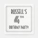 This elegant fourth birthday party paper napkin design features an editable name, an intricate art deco style inspired number “4th”, the message “BIRTHDAY PARTY!”, and a border pattern consisting of lines. Birthday themed paper napkins like these might be used at a birthday party celebrating somebody’s 4th birthday. [~Z0000613]