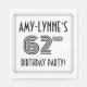 This elegant and 1920s/1930s style inspired sixty-second birthday party/celebration paper napkin design features a custom name, a fancy art deco style inspired number “62nd”, the message “BIRTHDAY PARTY!”, and a multi-line border. Paper napkins like these might be used when celebrating somebody’s sixty second birthday. [~Z0000613]
