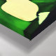 Canvas in a modern, semi-abstract, Art Deco portrait of a lady in a kimono, holding a fan, against a jade green abstract background