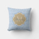A stylish light blue art deco fish scale pattern square throw pillow with a tan quatrefoil badge you can personalise by easily adding your monogram and name. This is part of the Little Boy Blue Fishcale Warm Sand Monogram Spring Collection.