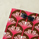 Beach towel in a reproduction of a stylised, Art Deco lily, wallpaper pattern - a soft gradient of deep to light coral pink, accented with white, on a dark chocolate brown background