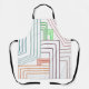 This apron has an art deco design of lines in purple, pink, orange, and blue.