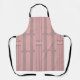 This apron has an art deco design of vertical lines with diamonds and circles in silver on a field of pink.