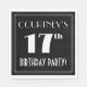 This elegant and Roaring Twenties inspired seventeenth birthday party/celebration paper napkin design features an editable name, an intricate art deco look inspired number “17th”, the message “BIRTHDAY PARTY!”, and a border pattern consisting of lines. It features a black-coloured background by default, but it can be customised to a different colour, if desired. Stylish paper napkins like these might be used when hosting a birthday party for somebody in celebration of their 17th birthday. [~Z0000612]