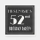 This elegant and 1920s/1930s style inspired fifty-second birthday party paper napkin design features an editable name, a fancy art deco style inspired number “52nd”, the message “BIRTHDAY PARTY!”, and a multi-line border. The background is coloured black by default, but it can be customised to a different colour, if desired. Birthday themed paper napkins like these might be used at a birthday party celebrating somebody’s fifty second birthday. [~Z0000612]