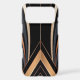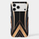 This abstract Art Deco design exudes luxury and sophistication with its sweeping metallic arcs in gold, copper, and grey against a deep black background. Symmetrical curves converge towards a central focal point, framed by sharp angular lines and vertical patterns, evoking glamour and retro elegance. Perfect for elevating home decor, office art, and stylish accessories with a timeless, opulent aesthetic.