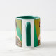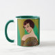 Coffee mug in a modern, semi-abstact, Art Deco inspired portrait of a demure lady, holding a fan, against a jade green and gold coloured background