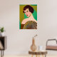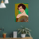 Poster in a modern, semi-abstract, Art Deco inspired portrait of a demure lady, holding a fan, against a jade green and gold coloured background