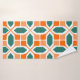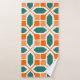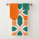 This towel set has a bath towel with an art deco design of hexagons, pentagons, squares, diagonal lines that look like a mosaic, a teal wash cloth, and an orange hand towel.