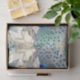 Art Nouveau stylised, jewel butterflies are paired with a Peacock in full spread tail feather for a scallop inspired pattern set over an Art Deco thin gold line floral arch and bamboo foliage design. This was designed into a scaleable, repeat pattern that you can size up or down. We offer it in 3 sizes and both horizontal and vertical design. See the collection by internationally licensed artist, Audrey Jeanne Roberts, copyright.