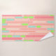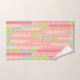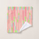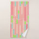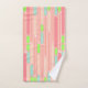 This towel set has an art deco inspired design made of long ovals filled with solid colour or lines in pink, green, and blue.