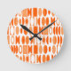 This clock has an art deco design made of ovals and half ovals in white and shades of orange.