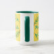 The colours are green, blue-green teal, orange, brown and red on a golden yellow-orange background. The font colours and background colour can be changed through "Customise It." Design appears on both sides of the mug.