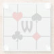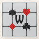 This personalised coaster features an Art Deco inspired original design w/a card playing theme composed of bright red & black card suit symbols (diamond, club, heart & spade) centred where the black thick & thin horizontal & vertical lines of a grid meet, w/a large custom text field for your monogram in the centre.
