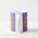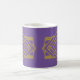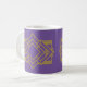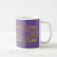 This mug has an art deco quilt-inspired design of diamond shapes and a rectangle, both in purple and gold.
