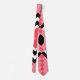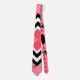 This tie has an art deco quilt-inspired design of diamond shapes in black, white, and pink on a field of watermelon.