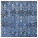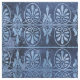 This Art Deco and Greek inspired design has a distressed blue background with ornate light blue fans and scrollwork.