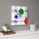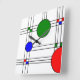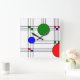 This wall clock has an art deco stained-glass window design of black lines and red, blue, and green squares and circles.