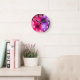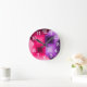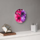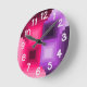 This wall clock has an art deco design of squares in pink and purple with each layer overlapping the layer before it.