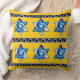 And a bright, sunny, "Good Morning" to You! That's the message you'll be greeted with when you drowsily tread through the living room to kitchen and set your eyes on this extra plump, extra cushy, extra happy looking throw pillow featuring Leslie Sigal Javorek's original vivid blue & white stained glass Star of David; in 2 rows of 3 stars separated by stripes of a silvery greek key pattern on black & set on a bright taxi yellow background. On back is the same yellow by itself.