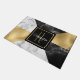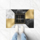 Modern take on an Art Deco inspired door mat, done in a geometric pattern of gold tone foil, white marble and black marble. A black and gold square, in the middle, has a golden yellow single letter monogram and white text ready to personalise. Lovely home decor and makes a great gift idea.