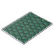 Abstract geometric wavy pattern in Art Deco style on with teal green and copper coloured waves and fan decoration on dark teal green colour background