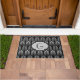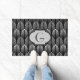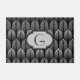 Doormat in a vintage Art Deco wallpaper pattern based on a stylised feather - shades of silver grey / grey on a black background with customisable monogram