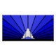 An iconic pattern of the sun rising from behind a stylized art deco shaped building. A simple yet elegant design, true to the era.
