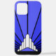 An iconic pattern of the sun rising from behind a stylized art deco shaped building. A simple yet elegant design, true to the era.