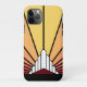 An iconic pattern of the sun rising from behind a stylized art deco shaped building. A simple yet elegant design, true to the era.